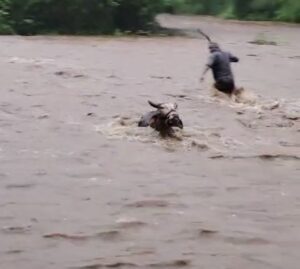 નર્મદા જિલ્લામાં બે દિવસથીભારે વરસાદ વરસ્યો હતો. અરબી સમુદ્રમાં સક્રિય થયેલી વરસાદી સિસ્ટમને કારણે જિલ્લાના 5 તાલુકામાં વરસાદ નોંધાયો હતો.જેમાં ગરુડેશ્વર તાલુકાના ઝરવાણી ગામમાં ગામમાં ૩ પશુ તણાયાની ઘટના બની છે.ગામના બાબુભાઈ ચુનીલાલભાઈ તડવી પોતાના પશુઓને ચરાવવા ગયા હતા. અચાનક ઝરવાણી ખાડીમાં પાણીનું વહેણ વધતા આવ-જા માટેના રસ્તા પર પાણી ફરી વળ્યા હતા. આ પૂરમાં તેમના 4 પશુઓ તણાઈ ગયા હતા. જેમાંથી એક પશુને બચાવી લેવામાં આવ્યું હતું.જ્યારે બીજા 3 પશુ તણાઈ ગયા હતા. હવે વરસાદ વિરામ લે અને પાણી વહેણ ઓછો થાય ત્યારે આ પશુઓની શોધ ખોળ કરવામાં આવશે. એક યુવાને પાણી માં જઈ આ પશુઑ ને બચાવવાની કોશિશ કરી હતી. એક યુવાન પણ પાણીના વહેણમાં ફસાયો હતો. જોકે, તેણે ભારે જહેમત બાદ જાતે પોતાનો બચાવ કર્યો હતો.