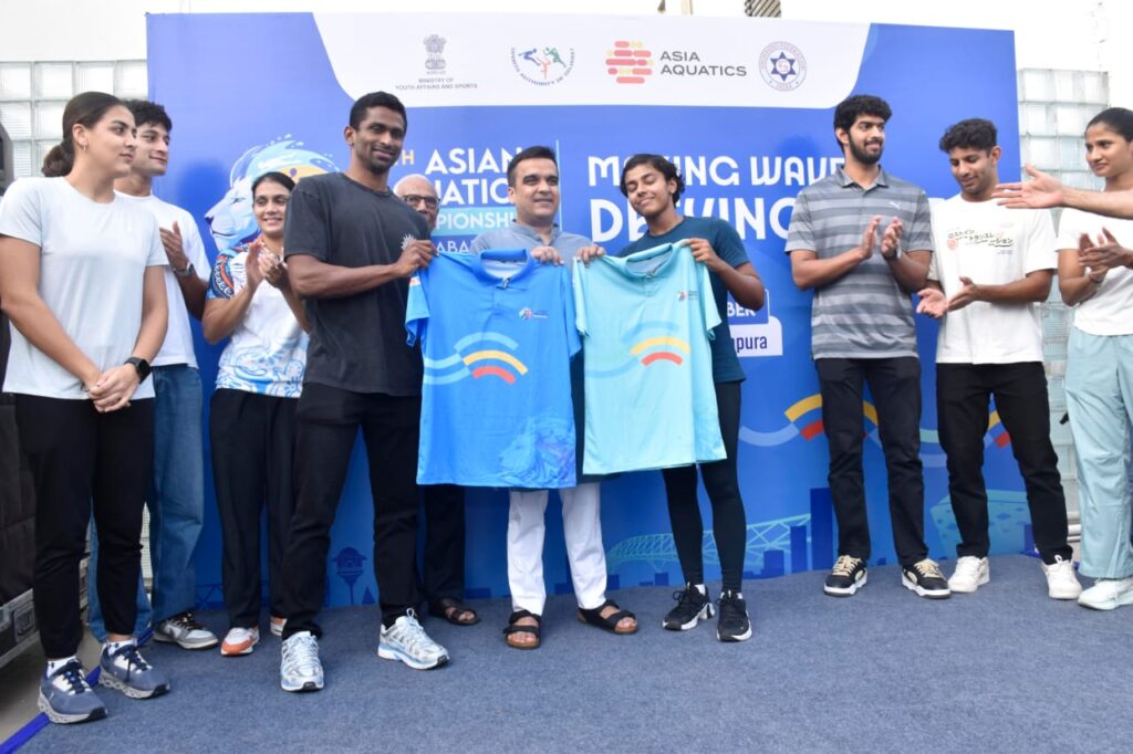 સ્વિમિંગ ફેડરેશન ઓફ ઈન્ડિયા દ્વારા ‘૧૧મી એશિયન અક્વાટિક્સ ચેમ્પિયનશિપ – અમદાવાદ ૨૦૨૫’ માટે સત્તાવાર જર્સીનું અનાવરણ યુવા, રમતગમત અને સાંસ્કૃતિક પ્રવૃત્તિઓ મંત્રી શ્રી હર્ષભાઈ સંઘવીના હસ્તે સેક્ટર-૨૧ જીમખાના, ગાંધીનગર ખાતે કરવામાં આવ્યું હતું.