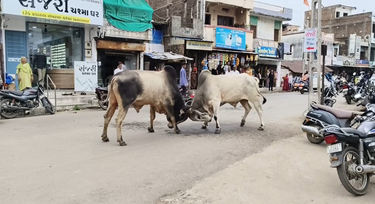 રાજપીપલા માં બે આખલાઓ વચ્ચે જાહેર રોડ પર એક કલાક સુધી ચાલ્યું આખલા યુદ્ધ ચાલ્યું.