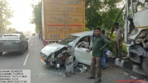 વડોદરા થી હાલોલ ના ધમધમતા ધોરીમાર્ગ પર દશૅન હોટલ સામે બંધ બોડી ની આઇસર એક કન્ટેનર અને બે કાર કુલ મળીને ચાર વાહનો વચ્ચે વિચિત્ર અકસ્માત લ ઇ ને માગૅ પરથી જતાં આવતાં રાહદારીઓ ટ્રાફીક જામ ની સ્થિતિ સજૉતા વાહન ચાલકો અટવાયા હતા