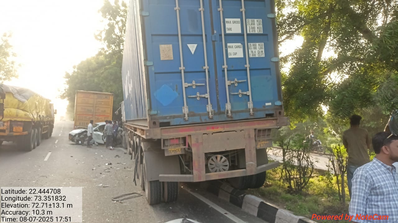 વડોદરા થી હાલોલ ના ધમધમતા ધોરીમાર્ગ પર દશૅન હોટલ સામે બંધ બોડી ની આઇસર એક કન્ટેનર અને બે કાર કુલ મળીને ચાર વાહનો વચ્ચે વિચિત્ર અકસ્માત લ ઇ ને માગૅ પરથી જતાં આવતાં રાહદારીઓ ટ્રાફીક જામ ની સ્થિતિ સજૉતા વાહન ચાલકો અટવાયા હતા