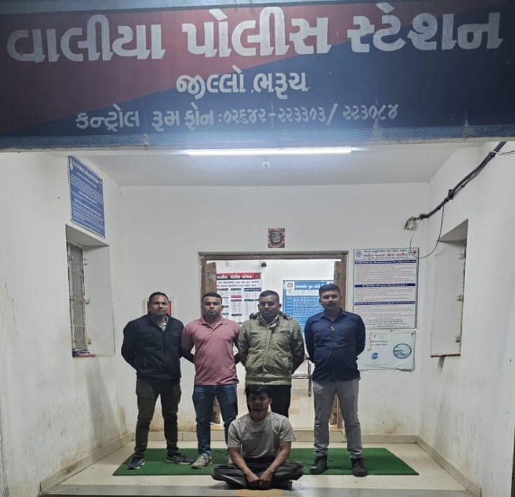 પૂછપરછ દરમિયાન આરોપીએ પોતાનું નામ મેહુલભાઈ રમેશભાઈ વસાવા (ઉંમર ૨૭, રહે. મેરા લીંબડા ફળિયું, તા. વાલિયા, જિ. ભરૂચ) જણાવ્યું હતું. પોલીસે તેની ધરપકડ કરીને ગુનાના કામે આગળની કાયદેસરની કાર્યવાહી હાથ ધરી છે.