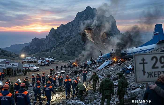 અહેવાલ : ( રવિકુમાર કાયસ્થ ) રશિયાના ક્રીમિયામાં બુધવારે સવારે એક મોટી સૈન્ય હોનારત સર્જાઈ છે. રશિયન સેનાનું An-26 વિમાન એક ઊંચા પહાડ સાથે અથડાવાને કારણે ક્રેશ થઈ ગયું છે. આ ભીષણ અકસ્માતમાં વિમાનમાં સવાર તમામ 29 લોકોના મોત થયા હોવાની પુષ્ટિ થઈ છે. રશિયન સંરક્ષણ મંત્રાલયના જણાવ્યા અનુસાર, વિમાનમાં 23 મુસાફરો અને 6 ક્રૂ મેમ્બર્સ સવાર હતા, જેમાંથી કોઈ પણ જીવિત બચ્યું નથી.