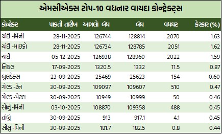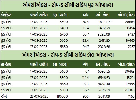 મિની પુટ ઓપ્શન્સમાં ક્રૂડ તેલ-મિની સપ્ટેમ્બર રૂ.5500ની સ્ટ્રાઇક પ્રાઇસવાળો પુટ ઓપ્શન બેરલદીઠ રૂ.4.2 ઘટી રૂ.71.7 થયો હતો. નેચરલ ગેસ-મિની સપ્ટેમ્બર રૂ.260ની સ્ટ્રાઇક પ્રાઇસવાળો પુટ ઓપ્શન એમએમબીટીયૂદીઠ રૂ.2 વધી રૂ.11.95 થયો હતો. સોનું-મિની સપ્ટેમ્બર રૂ.109000ની સ્ટ્રાઇક પ્રાઇસવાળો પુટ ઓપ્શન 10 ગ્રામદીઠ રૂ.266 ઘટી રૂ.1040 થયો હતો. ચાંદી-મિની સપ્ટેમ્બર રૂ.124000ની સ્ટ્રાઇક પ્રાઇસવાળો પુટ ઓપ્શન કિલોદીઠ રૂ.506.5 ઘટી રૂ.816.5ના ભાવે બોલાયો હતો.