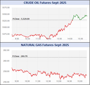 એનર્જી સેગમેન્ટમાં રૂ. 1858.78 કરોડનાં કામકાજ થયાં હતાં. એમસીએક્સ ઇલેક્ટ્રિસિટી સપ્ટેમ્બર વાયદો એમડબલ્યુએચદીઠ રૂ.3886ના ભાવે ખૂલી, ઉપરમાં રૂ.3911 અને નીચામાં રૂ.3873ના મથાળે અથડાઈ, રૂ.11 ઘટી રૂ.3900ના ભાવે ટ્રેડ થઈ રહ્યો હતો. ક્રૂડ તેલ સપ્ટેમ્બર વાયદો બેરલદીઠ રૂ.5480ના ભાવે ખૂલી, ઉપરમાં રૂ.5553 અને નીચામાં રૂ.5454ના મથાળે અથડાઈ, રૂ.5529ના આગલા બંધ સામે રૂ.15 વધી રૂ.5544ના સ્તરે પહોંચ્યો હતો. ક્રૂડ તેલ-મિની સપ્ટેમ્બર વાયદો રૂ.16 વધી રૂ.5547ના ભાવે ટ્રેડ થઈ રહ્યો હતો. નેચરલ ગેસ સપ્ટેમ્બર વાયદો એમએમબીટીયુદીઠ રૂ.3.8 ઘટી રૂ.256.9ના ભાવે ટ્રેડ થઈ રહ્યો હતો. નેચરલ ગેસ-મિની સપ્ટેમ્બર વાયદો રૂ.3.7 ઘટી રૂ.257.1ના ભાવે બોલાયો હતો.