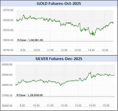 કીમતી ધાતુઓમાં સોના-ચાંદીના વાયદાઓમાં રૂ. 17976.54 કરોડનાં કામકાજ થયાં હતાં. એમસીએક્સ સોનું ઓક્ટોબર વાયદો 10 ગ્રામદીઠ રૂ.109352ના ભાવે ખૂલી, ઉપરમાં રૂ.109656 અને નીચામાં રૂ.109122ના મથાળે અથડાઈ, રૂ.108981ના આગલા બંધ સામે રૂ.470ની તેજી સાથે રૂ.109451 થયો હતો. ગોલ્ડ-ગિની સપ્ટેમ્બર વાયદો 8 ગ્રામદીઠ રૂ.345 વધી રૂ.87738 થયો હતો. ગોલ્ડ-પેટલ સપ્ટેમ્બર વાયદો 1 ગ્રામદીઠ રૂ.50 વધી રૂ.10999ના ભાવે ટ્રેડ થઈ રહ્યો હતો. સોનું-મિની ઓક્ટોબર વાયદો 10 ગ્રામદીઠ રૂ.488 વધી રૂ.109358ના ભાવે બોલાયો હતો. ગોલ્ડ-ટેન સપ્ટેમ્બર વાયદો 10 ગ્રામદીઠ રૂ.109479ના ભાવે ખૂલી, ઉપરમાં રૂ.109752 અને નીચામાં રૂ.109328ના સ્તરને સ્પર્શી, રૂ.109097ના આગલા બંધ સામે રૂ.510 વધી રૂ.109607ના ભાવે ટ્રેડ થઈ રહ્યો હતો.