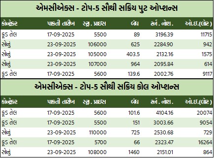 મિની પુટ ઓપ્શન્સમાં ક્રૂડ તેલ-મિની સપ્ટેમ્બર રૂ.5500ની સ્ટ્રાઇક પ્રાઇસવાળો પુટ ઓપ્શન બેરલદીઠ રૂ.75.5 ઘટી રૂ.90.45 થયો હતો. નેચરલ ગેસ-મિની સપ્ટેમ્બર રૂ.275ની સ્ટ્રાઇક પ્રાઇસવાળો પુટ ઓપ્શન એમએમબીટીયૂદીઠ રૂ.4.05 ઘટી રૂ.12ના ભાવે બોલાયો હતો. સોનું-મિની સપ્ટેમ્બર રૂ.106000ની સ્ટ્રાઇક પ્રાઇસવાળો પુટ ઓપ્શન 10 ગ્રામદીઠ રૂ.122.5 ઘટી રૂ.667ના ભાવે બોલાયો હતો. ચાંદી-મિની સપ્ટેમ્બર રૂ.123000ની સ્ટ્રાઇક પ્રાઇસવાળો પુટ ઓપ્શન કિલોદીઠ રૂ.217.5 ઘટી રૂ.1651 થયો હતો.