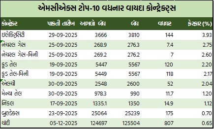 ઇલેક્ટ્રિસિટીના વાયદામાં રૂ.62.23 કરોડનાં કામકાજ થયાં હતાં. ક્રૂડ તેલ અને ક્રૂડ તેલ-મિનીના વાયદાઓમાં રૂ.630.68 કરોડનાં કામકાજ થયાં હતાં. નેચરલ ગેસ અને નેચરલ ગેસ-મિનીના વાયદાઓમાં રૂ.1673.89 કરોડનાં કામ થયાં હતાં. મેન્થા તેલના વાયદામાં રૂ.10.16 કરોડનાં કામ થયાં હતાં. એલચીના વાયદામાં રૂ.1.10 કરોડનાં કામ થયાં હતાં.