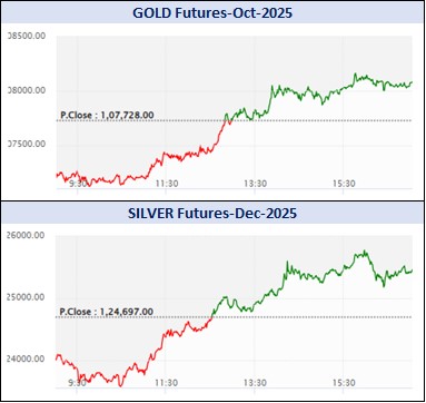 કીમતી ધાતુઓમાં સોના-ચાંદીના વાયદાઓમાં રૂ.18507.52 કરોડનાં કામકાજ થયાં હતાં. એમસીએક્સ સોનું ઓક્ટોબર વાયદો 10 ગ્રામદીઠ રૂ.107456ના ભાવે ખૂલી, ઉપરમાં રૂ.108175ના ઓલ ટાઇમ હાઇને સ્પર્શી, નીચામાં રૂ.107101ના મથાળે અથડાઈ, રૂ.107728ના આગલા બંધ સામે રૂ.330 વધી રૂ.108058 થયો હતો. ગોલ્ડ-ગિની સપ્ટેમ્બર વાયદો 8 ગ્રામદીઠ રૂ.218 વધી રૂ.86652ના ભાવે બોલાયો હતો. ગોલ્ડ-પેટલ સપ્ટેમ્બર વાયદો 1 ગ્રામદીઠ રૂ.42 વધી રૂ.10854ના ભાવે બોલાયો હતો. સોનું-મિની ઓક્ટોબર વાયદો 10 ગ્રામદીઠ રૂ.380 વધી રૂ.107985ના ભાવે ટ્રેડ થઈ રહ્યો હતો. ગોલ્ડ-ટેન સપ્ટેમ્બર વાયદો 10 ગ્રામદીઠ રૂ.107615ના ભાવે ખૂલી, ઉપરમાં રૂ.108198 અને નીચામાં રૂ.107028ના મથાળે અથડાઈ, રૂ.107728ના આગલા બંધ સામે રૂ.403 વધી રૂ.108131ના ભાવે બોલાયો હતો.