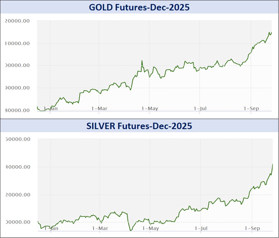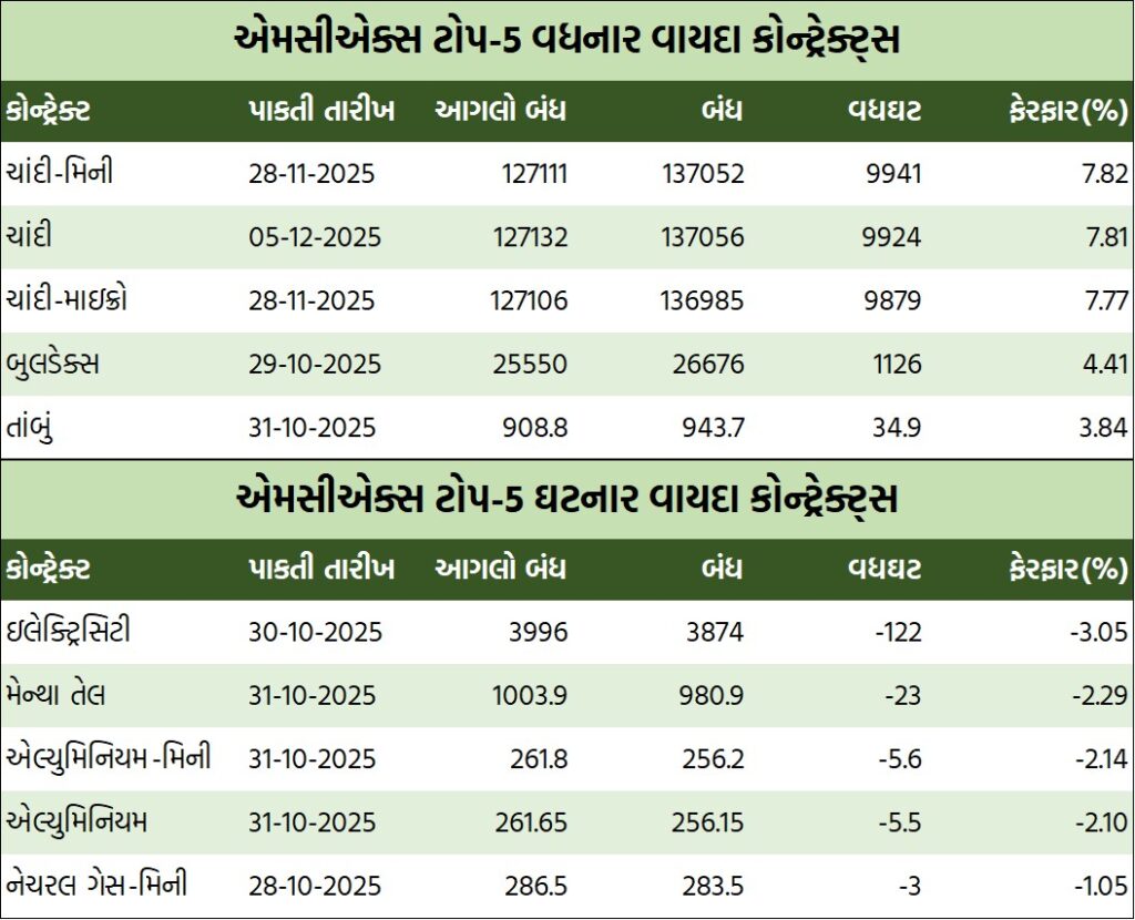 ચાંદીના વાયદાઓમાં ચાંદી ડિસેમ્બર વાયદો સપ્તાહના પ્રારંભે કિલોદીઠ રૂ.127500ના ભાવે ખૂલી, સપ્તાહ દરમિયાન ઇન્ટ્રા-ડેમાં ઉપરમાં રૂ.137530ના ઓલ ટાઇમ હાઇ અને નીચામાં રૂ.127500ના સ્તરને સ્પર્શી, રૂ.127132ના આગલા બંધ સામે સપ્તાહના અંતે રૂ.9924ના વ્યાપક ઉછાળા સાથે રૂ.137056ના સ્તરે પહોંચ્યો હતો. સપ્તાહ દરમિયાન કિલોદીઠ ચાંદી-મિની નવેમ્બર વાયદો રૂ.137451ના ઓલ ટાઇમ હાઇને સ્પર્શી સપ્તાહના અંતે રૂ.9941 ઊછળી રૂ.137052ના સ્તરે પહોંચ્યો હતો. ચાંદી-માઇક્રો નવેમ્બર વાયદો સપ્તાહ દરમિયાન રૂ.137444ના ઓલ ટાઇમ હાઇ બોલાઇ, સપ્તાહના અંતે રૂ.9879 વધી રૂ.136985 થયો હતો.