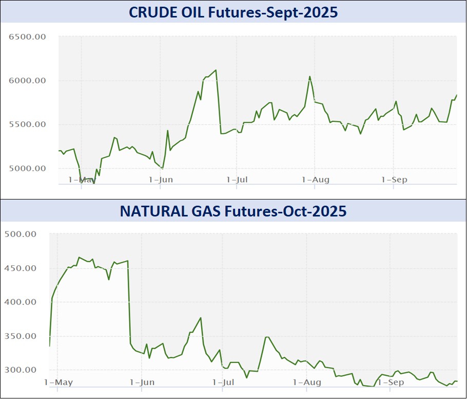એનર્જી સેગમેન્ટમાં રૂ.36287.41 કરોડનાં કામકાજ થયાં હતાં. એમસીએક્સ ઇલેક્ટ્રિસિટી ઓક્ટોબર વાયદો સપ્તાહના પ્રારંભે એમડબલ્યુએચદીઠ રૂ.3990ના ભાવે ખૂલી, સપ્તાહ દરમિયાન ઇન્ટ્રા-ડેમાં ઉપરમાં રૂ.4003 અને નીચામાં રૂ.3843ના સ્તરને સ્પર્શી, રૂ.122 ઘટી રૂ.3874ના સ્તરે પહોંચ્યો હતો. ક્રૂડ તેલ ઓક્ટોબર વાયદો સપ્તાહના પ્રારંભે બેરલદીઠ રૂ.5574ના ભાવે ખૂલી, સપ્તાહ દરમિયાન ઇન્ટ્રા-ડેમાં ઉપરમાં રૂ.5783 અને નીચામાં રૂ.5462ના સ્તરને સ્પર્શી, રૂ.5583ના આગલા બંધ સામે સપ્તાહના અંતે રૂ.190 વધી રૂ.5773ના ભાવે બંધ થયો હતો. ક્રૂડ તેલ-મિની ઓક્ટોબર વાયદો રૂ.186 વધી રૂ.5773 થયો હતો. નેચરલ ગેસ ઓક્ટોબર વાયદો સપ્તાહના અંતે એમએમબીટીયુદીઠ રૂ.2.9 ઘટી રૂ.283.4 થયો હતો. નેચરલ ગેસ-મિની ઓક્ટોબર વાયદો રૂ.3 ઘટી સપ્તાહના અંતે રૂ.283.5ના સ્તરે પહોંચ્યો હતો.