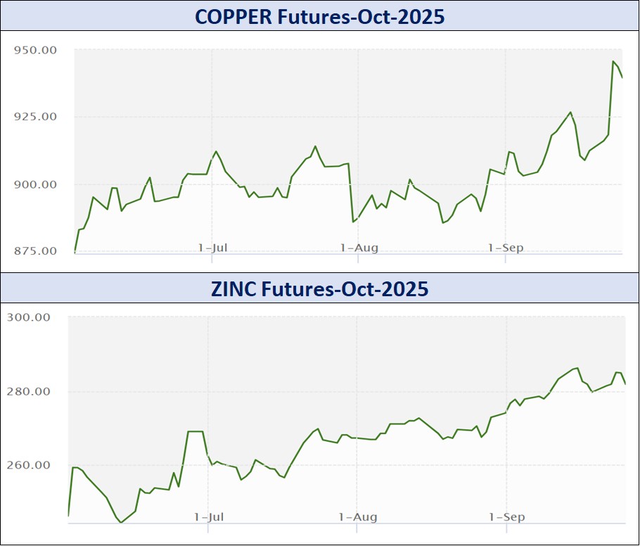 બિનલોહ ધાતુઓમાં રૂ.17709.18 કરોડનાં કામકાજ થયાં હતાં. સપ્તાહના અંતે કિલોદીઠ તાંબું ઓક્ટોબર વાયદો રૂ.34.9 વધી રૂ.943.7ના સ્તરે પહોંચ્યો હતો. જસત ઓક્ટોબર વાયદો રૂ.3.05 વધી રૂ.284.9ના ભાવે સપ્તાહના અંતે બંધ થયો હતો. એલ્યુમિનિયમ ઓક્ટોબર વાયદો રૂ.5.5 ઘટી સપ્તાહના અંતે રૂ.256.15ના ભાવે બોલાયો હતો. સીસું ઓક્ટોબર વાયદો સપ્તાહના અંતે 10 પૈસા ઘટી રૂ.183.25ના ભાવે બંધ થયો હતો.