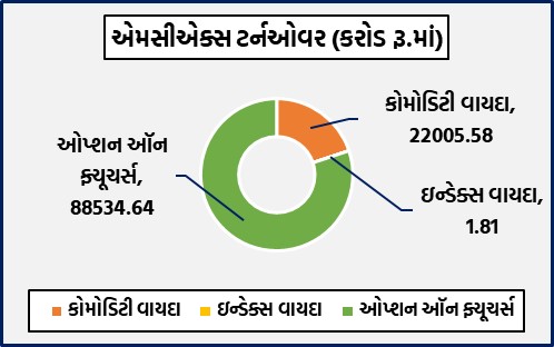દેશના અગ્રણી કોમોડિટી ડેરિવેટિવ્ઝ એક્સચેન્જ એમસીએક્સ પર વિવિધ કોમોડિટી વાયદા, ઓપ્શન્સ અને ઇન્ડેક્સ ફ્યુચર્સમાં રૂ.110542.03 કરોડનું ટર્નઓવર નોંધાયું હતું. કોમોડિટી વાયદાઓમાં રૂ.22005.58 કરોડનાં કામકાજ થયાં હતાં. કોમોડિટી ઓપ્શન્સમાં રૂ.88534.64 કરોડનું નોશનલ ટર્નઓવર નોંધાયું હતું. બુલિયન ઇન્ડેક્સ બુલડેક્સ સપ્ટેમ્બર વાયદો 25239 પોઇન્ટના સ્તરે ટ્રેડ થઈ રહ્યો હતો. કોમોડિટી ઓપ્શન્સમાં કુલ પ્રીમિયમ ટર્નઓવર રૂ.1175.72 કરોડનું થયું હતું.