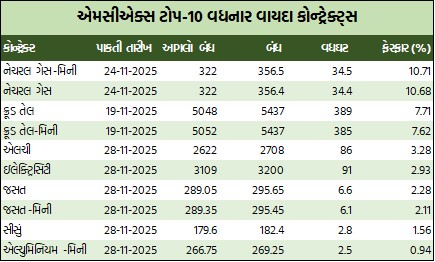 એનર્જી સેગમેન્ટમાં રૂ.33531.45 કરોડનાં કામકાજ થયાં હતાં. એમસીએક્સ ઇલેક્ટ્રિસિટી નવેમ્બર વાયદો સપ્તાહના પ્રારંભે એમડબલ્યુએચદીઠ રૂ.3115ના ભાવે ખૂલી, સપ્તાહ દરમિયાન ઇન્ટ્રા-ડેમાં ઉપરમાં રૂ.3259 અને નીચામાં રૂ.3001ના સ્તરને સ્પર્શી, સપ્તાહના અંતે રૂ.91 વધી રૂ.3200ના સ્તરે બંધ થયો હતો. ક્રૂડ તેલ નવેમ્બર વાયદો સપ્તાહના પ્રારંભે બેરલદીઠ રૂ.5003ના ભાવે ખૂલી, સપ્તાહ દરમિયાન ઇન્ટ્રા-ડેમાં ઉપરમાં રૂ.5475 અને નીચામાં રૂ.4944ના સ્તરને સ્પર્શી, રૂ.5048ના આગલા બંધ સામે સપ્તાહના અંતે રૂ.389ના ઉછાળા સાથે રૂ.5437ના ભાવે બંધ થયો હતો. ક્રૂડ તેલ-મિની નવેમ્બર વાયદો રૂ.385 ઊછળી રૂ.5437 થયો હતો. નેચરલ ગેસ નવેમ્બર વાયદો એમએમબીટીયુદીઠ રૂ.34.4 વધી રૂ.356.4 થયો હતો. નેચરલ ગેસ-મિની નવેમ્બર વાયદો રૂ.34.5 વધી રૂ.356.5ના સ્તરે બંધ થયો હતો.
