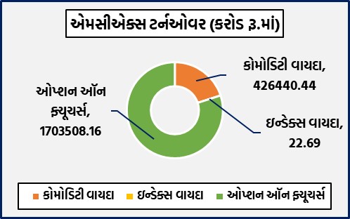 મુંબઈઃ દેશના અગ્રણી કોમોડિટી ડેરિવેટિવ્ઝ એક્સચેન્જ એમસીએક્સ પર 17થી 23 ઓક્ટોબરના સપ્તાહ દરમિયાન વિવિધ કોમોડિટી વાયદા, ઓપ્શન્સ અને ઇન્ડેક્સ ફ્યુચર્સમાં રૂ.2129971.29 કરોડનું ટર્નઓવર નોંધાયું હતું. કોમોડિટી વાયદાઓમાં રૂ.426440.44 કરોડનાં કામકાજ થયાં હતાં. કોમોડિટી ઓપ્શન્સમાં રૂ.1703508.16 કરોડનું નોશનલ ટર્નઓવર નોંધાયું હતું. બુલિયન ઇન્ડેક્સ બુલડેક્સ ઓક્ટોબર વાયદો 28703 પોઇન્ટના સ્તરે બંધ થયો હતો. કોમોડિટી ઓપ્શન્સમાં કુલ સાપ્તાહિક પ્રીમિયમ ટર્નઓવર રૂ.29992.56 કરોડનું થયું હતું.