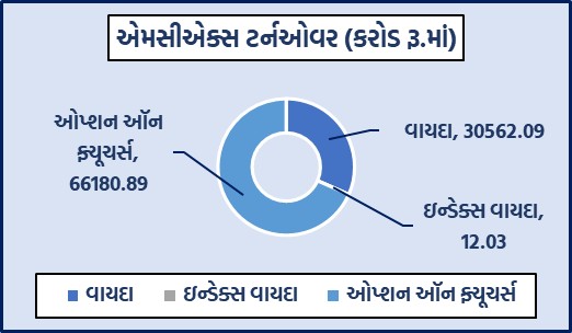 મુંબઈઃ દેશના અગ્રણી કોમોડિટી ડેરિવેટિવ્ઝ એક્સચેન્જ એમસીએક્સ પર વિવિધ કોમોડિટી વાયદા, ઓપ્શન્સ તથા ઇન્ડેક્સ ફ્યુચર્સ અને ઓપ્શન્સમાં રૂ.96756.43 કરોડનું ટર્નઓવર નોંધાયું હતું. કોમોડિટી વાયદાઓમાં રૂ.30562.09 કરોડનાં કામકાજ થયાં હતાં. કોમોડિટી વાયદા પરના ઓપ્શન્સમાં રૂ.66180.89 કરોડનું નોશનલ ટર્નઓવર નોંધાયું હતું. બુલિયન ઇન્ડેક્સ બુલડેક્સ જાન્યુઆરી વાયદો 35549 પોઇન્ટના સ્તરે ટ્રેડ થઈ રહ્યો હતો. કોમોડિટી ઓપ્શન્સમાં કુલ પ્રીમિયમ ટર્નઓવર રૂ.1672.35 કરોડનું થયું હતું.