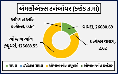 મુંબઈઃ દેશના અગ્રણી કોમોડિટી ડેરિવેટિવ્ઝ એક્સચેન્જ એમસીએક્સ પર વિવિધ કોમોડિટી વાયદા, ઓપ્શન્સ તથા ઇન્ડેક્સ ફ્યુચર્સ અને ઓપ્શન્સમાં રૂ.151767.5 કરોડનું ટર્નઓવર નોંધાયું હતું. કોમોડિટી વાયદાઓમાં રૂ.26080.69 કરોડનાં કામકાજ થયાં હતાં. કોમોડિટી વાયદા પરના ઓપ્શન્સમાં રૂ.125683.55 કરોડનું નોશનલ ટર્નઓવર નોંધાયું હતું. ઇન્ડેક્સ વાયદાઓમાં રૂ.2.62 કરોડ અને ઇન્ડેક્સ ઓપ્શન્સમાં રૂ.0.64 કરોડનાં કામકાજ થયાં હતાં. બુલિયન ઇન્ડેક્સ બુલડેક્સ નવેમ્બર વાયદો 30068 પોઇન્ટના સ્તરે ટ્રેડ થઈ રહ્યો હતો. કોમોડિટી ઓપ્શન્સમાં કુલ પ્રીમિયમ ટર્નઓવર રૂ.1553.54 કરોડનું થયું હતું.