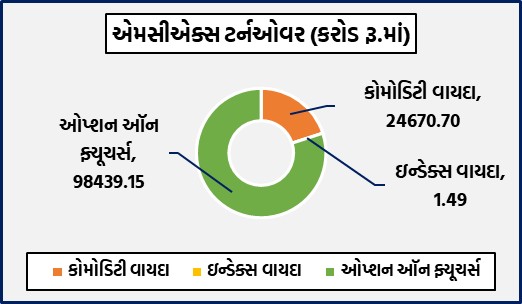 મુંબઈઃ દેશના અગ્રણી કોમોડિટી ડેરિવેટિવ્ઝ એક્સચેન્જ એમસીએક્સ પર વિવિધ કોમોડિટી વાયદા, ઓપ્શન્સ અને ઇન્ડેક્સ ફ્યુચર્સમાં રૂ.123111.34 કરોડનું ટર્નઓવર નોંધાયું હતું. કોમોડિટી વાયદાઓમાં રૂ.24670.7 કરોડનાં કામકાજ થયાં હતાં. કોમોડિટી ઓપ્શન્સમાં રૂ.98439.15 કરોડનું નોશનલ ટર્નઓવર નોંધાયું હતું. બુલિયન ઇન્ડેક્સ બુલડેક્સ ઓગસ્ટ વાયદો 23636 પોઇન્ટના સ્તરે ટ્રેડ થઈ રહ્યો હતો. કોમોડિટી ઓપ્શન્સમાં કુલ પ્રીમિયમ ટર્નઓવર રૂ.1350.17 કરોડનું થયું હતું.