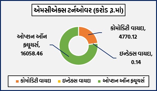 મુંબઈઃ દેશના અગ્રણી કોમોડિટી ડેરિવેટિવ્ઝ એક્સચેન્જ એમસીએક્સ પર વિવિધ કોમોડિટી વાયદા, ઓપ્શન્સ અને ઇન્ડેક્સ ફ્યુચર્સમાં રૂ.20828.72 કરોડનું ટર્નઓવર નોંધાયું હતું. કોમોડિટી વાયદાઓમાં રૂ.4770.12 કરોડનાં કામકાજ થયાં હતાં. કોમોડિટી ઓપ્શન્સમાં રૂ.16058.46 કરોડનું નોશનલ ટર્નઓવર નોંધાયું હતું. બુલિયન ઇન્ડેક્સ બુલડેક્સ ઓગસ્ટ વાયદો 23201 પોઇન્ટના સ્તરે હતો. કોમોડિટી ઓપ્શન્સમાં કુલ પ્રીમિયમ ટર્નઓવર રૂ.226.8 કરોડનું થયું હતું.