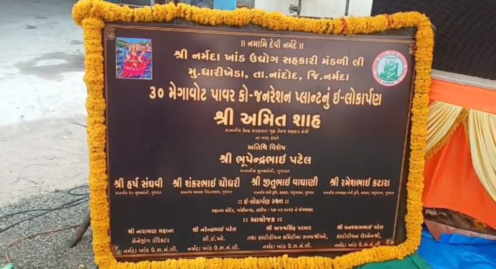 જેમાં નર્મદા જિલ્લાની ધારીખેડા નર્મદા સુગર સહકારી મંડળીમાં ત્રણ નવા પ્રોજેક્ટ માં પહેલો 30 મેગાવોટનો વીજળીનો પ્રોજેક્ટ બીજો 45 કિલો પ્રતિદિવસ ઇથેનોલ પ્રોજેક્ટ અને ત્રીજો 50 મેટ્રિક ટન ઓર્ગેનિક પોટાશના ઉત્પાદન પ્લાન્ટનું એ લોકાર્પણ કરાવમાં આવ્યું ,આ પ્રસંગે યોજાયેલા કાર્યક્રમ માં ધારીખેડા નર્મદા સુગર સહકારી મંડળી ના કસ્ટોડિયન કમિટીના ચેરમેન ઘનશ્યામભાઈ પટેલ ગાંધીનગર ખાતે ઉપસ્થિત રહ્યા હતા અને ધારીખેડા નર્મદા સુગર સહકારી મંડળી ના કેમ્પસમાં મોટી સઁખ્યામા સભાસદો અને કમિટી સભ્યો ઉપસ્થિતત રહ્યા હતા.