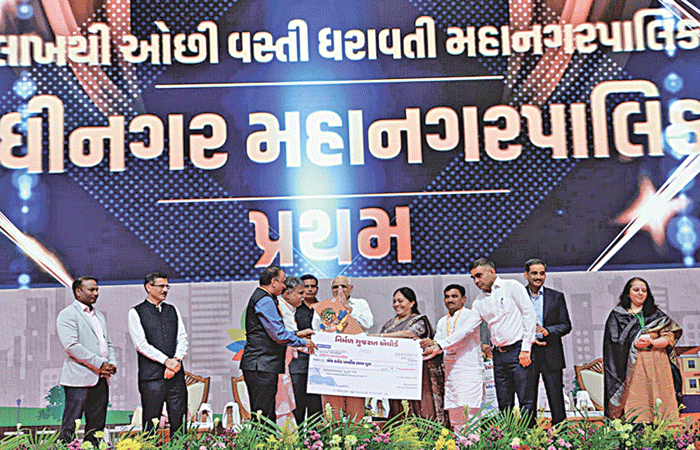 ભારત સરકારના સ્વચ્છ ભારત મિશનના ભાગરૃપે, રાજ્ય સરકાર દ્વારા નિર્મળ ગુજરાત ૨.૦ અભિયાન હેઠળ ‘મારું શહેર, સ્વચ્છ શહેર’ ત્રિમાસિક પ્રતિયોગિતાનું આયોજન કરવામાં આવ્યું હતું. આ પ્રતિયોગિતાના મૂલ્યાંકન માટે, સ્વચ્છ સર્વેક્ષણના તમામ નિર્ધારિત ઘટકોના આધારે, નિયુક્ત કરાયેલ થર્ડ પાર્ટી એજન્સી દ્વારા દર ત્રણ મહિને મહાનગરપાલિકાઓ અને નગરપાલિકાઓમાં સ્થળ તપાસ હાથ ધરવામાં આવી હતી અને તેમાં નાગરિકોના પ્રતિભાવોને પણ મહત્વ આપવામાં આવ્યું હતું. થર્ડ પાર્ટી એજન્સી દ્વારા રજૂ કરવામાં આવેલ ત્રિમાસિક રિપોર્ટ્સની રાજ્ય કક્ષાએથી ઝીણવટપૂર્વક ચકાસણી કરવામાં આવી હતી, જેના આધારે આજે મહાત્મા મંદિર ખાતે યોજાયેલા કાર્યક્રમમાં ગાંધીનગર મહાનગરપાલિકાને ત્રણ લાખથી દસ લાખ સુધીની વસ્તી ધરાવતા શહેરોમાં સ્વચ્છતા ક્ષેત્રે પ્રથમ નંબર જાહેર કરવામાં આવ્યો હતો. ગાંધીનગરને આ એવોર્ડની સાથે ઇનામ તરીકે ૧.૨૫ કરોડ રૃપિયા પણ મળ્યા છે. મેયર મીરાબેન પટેલ, સ્ટેન્ડિંગ કમિટી ચેરમેન ગૌરાંગ વ્યાસ અને મ્યુનિસિપલ કમિશનર જે.એન. વાઘેલાએ આ એવોર્ડ સ્વીકાર્યો હતો.મહાનગરપાલિકાએ સોલિડ વેસ્ટ મેનેજમેન્ટમાં આધુનિક ટેક્નોલોજી અપનાવી છે, જેના દ્વારા કચરાનું ૧૦૦ ટકા ડોર-ટુ-ડોર કલેક્શન અને વૈજ્ઞાાનિક પદ્ધતિથી પ્રોસેસિંગ સુનિશ્ચિત કરવામાં આવ્યું છે. સ્વચ્છતા અભિયાનમાં નાગરિકોની સક્રિય ભાગીદારી સુનિશ્ચિત કરવા માટે સઘન જાગૃતિ કાર્યક્રમોનું આયોજન કરવામાં આવ્યું, જેના પરિણામે નાગરિકો દ્વારા કચરાનું સોર્સ સેગ્રીગેશન વધારવામાં આવ્યું છે.
