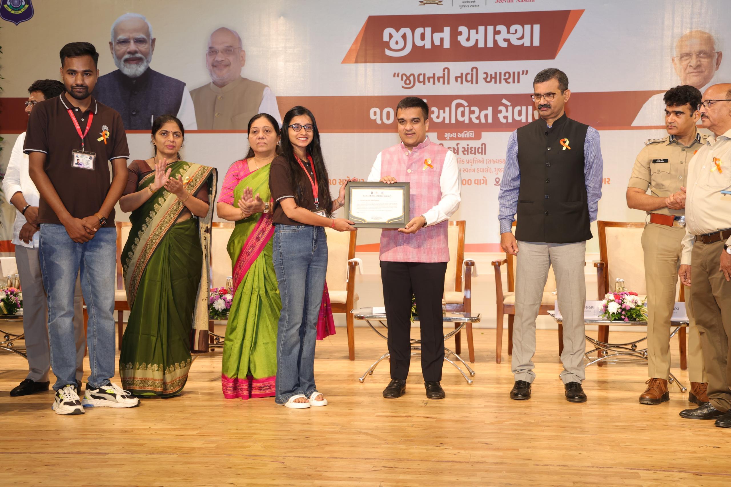 ગાંધીનગર શહેર ખાતે ટાઉન હોલમાં વિશ્વ આત્મહત્યા નિવારણ દિવસ નિમિત્તે યોજાયેલા કાર્યક્રમમાં આજે ગૃહ રાજ્ય મંત્રી શ્રી હર્ષ સંઘવીએ ગુજરાત પોલીસની ‘જીવન આસ્થા’ હેલ્પલાઇનની ૧૦ વર્ષની જ્વલંત સફળતાને બિરદાવી, હેલ્પલાઇનના સૌ કર્મચારીઓ, પોલીસ વિભાગના જવાનો અને અધિકારીઓ ઉપરાંત આ હેલ્પલાઇનની સેવામાં સદાય તત્પર રહેનાર મનોચિકિત્સકોને અભિનંદન પાઠવી તમામનું સન્માન કર્યુ હતું. તેમણે જણાવ્યું હતું કે, આ સ્પર્ધાત્મક યુગમાં લાખો નિરાશાઓની વચ્ચે ‘જીવન આસ્થા’ ગુજરાતના લાખો લોકોના દિલમાં આશાનું કિરણ જગાવવાનું પવિત્ર કાર્ય કરી રહી છે.