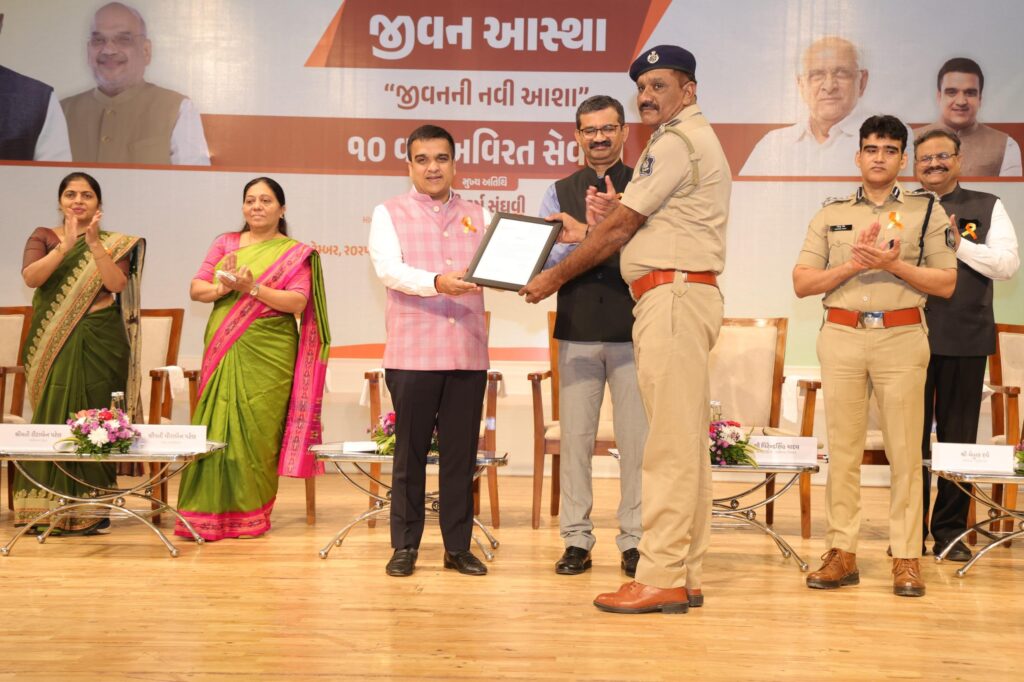 ગાંધીનગર શહેર ખાતે ટાઉન હોલમાં વિશ્વ આત્મહત્યા નિવારણ દિવસ નિમિત્તે યોજાયેલા કાર્યક્રમમાં આજે ગૃહ રાજ્ય મંત્રી શ્રી હર્ષ સંઘવીએ ગુજરાત પોલીસની ‘જીવન આસ્થા’ હેલ્પલાઇનની ૧૦ વર્ષની જ્વલંત સફળતાને બિરદાવી, હેલ્પલાઇનના સૌ કર્મચારીઓ, પોલીસ વિભાગના જવાનો અને અધિકારીઓ ઉપરાંત આ હેલ્પલાઇનની સેવામાં સદાય તત્પર રહેનાર મનોચિકિત્સકોને અભિનંદન પાઠવી તમામનું સન્માન કર્યુ હતું. તેમણે જણાવ્યું હતું કે, આ સ્પર્ધાત્મક યુગમાં લાખો નિરાશાઓની વચ્ચે ‘જીવન આસ્થા’ ગુજરાતના લાખો લોકોના દિલમાં આશાનું કિરણ જગાવવાનું પવિત્ર કાર્ય કરી રહી છે.