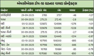 ચાંદીના વાયદાઓમાં ચાંદી ડિસેમ્બર વાયદો કિલોદીઠ રૂ.123996ના ભાવે ખૂલી, ઉપરમાં રૂ.124950 અને નીચામાં રૂ.123721ના મથાળે અથડાઈ, રૂ.125872ના આગલા બંધ સામે રૂ.1276 ઘટી રૂ.124596 થયો હતો. કિલોદીઠ ચાંદી-મિની નવેમ્બર વાયદો રૂ.1228 ઘટી રૂ.124450 થયો હતો. ચાંદી-માઇક્રો નવેમ્બર વાયદો રૂ.1214 ઘટી રૂ.124445 થયો હતો.