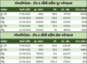 પુટ ઓપ્શન્સની વાત કરીએ તો, ક્રૂડ તેલ સપ્ટેમ્બર રૂ.5600ની સ્ટ્રાઇક પ્રાઇસવાળો પુટ ઓપ્શન બેરલદીઠ રૂ.28.2 વધી રૂ.157.7 થયો હતો. જ્યારે નેચરલ ગેસ સપ્ટેમ્બર રૂ.270ની સ્ટ્રાઇક પ્રાઇસવાળો પુટ ઓપ્શન એમએમબીટીયૂદીઠ રૂ.2.15 ઘટી રૂ.11.9ના ભાવે બોલાયો હતો.