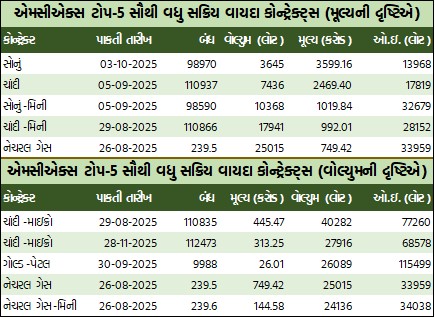 ઓપન ઇન્ટરેસ્ટ સોનાના વાયદાઓમાં 15698 લોટ, સોનું-મિનીના વાયદાઓમાં 58102 લોટ, ગોલ્ડ-ગિનીના વાયદાઓમાં 19115 લોટ, ગોલ્ડ-પેટલના વાયદાઓમાં 251170 લોટ અને ગોલ્ડ-ટેનના વાયદાઓમાં 21947 લોટના સ્તરે હતો. ચાંદીના વાયદાઓમાં 24943 લોટ, ચાંદી-મિનીના વાયદાઓમાં 48776 લોટ અને ચાંદી-માઇક્રો વાયદાઓમાં 174946 લોટના સ્તરે રહ્યો હતો. ઇલેક્ટ્રિસિટીના વાયદાઓમાં 916 લોટ, ક્રૂડ તેલના વાયદાઓમાં 16704 લોટ, નેચરલ ગેસના વાયદાઓમાં 57500 લોટના સ્તરે રહ્યો હતો.