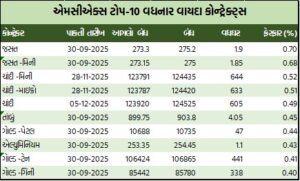 ચાંદીના વાયદાઓમાં ચાંદી ડિસેમ્બર વાયદો કિલોદીઠ રૂ.123500ના ભાવે ખૂલી, ઉપરમાં રૂ.125100 અને નીચામાં રૂ.123500ના સ્તરને સ્પર્શી, રૂ.123920ના આગલા બંધ સામે રૂ.605 વધી રૂ.124525ના સ્તરે પહોંચ્યો હતો. કિલોદીઠ ચાંદી-મિની નવેમ્બર વાયદો રૂ.644 વધી રૂ.124435ના સ્તરે પહોંચ્યો હતો. ચાંદી-માઇક્રો નવેમ્બર વાયદો રૂ.633 વધી રૂ.124420 થયો હતો.