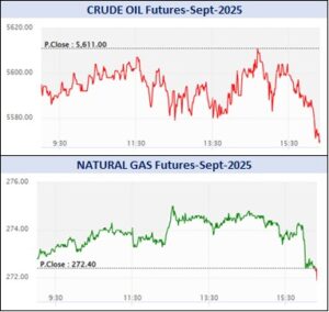 એનર્જી સેગમેન્ટમાં રૂ.1023.15 કરોડનાં કામકાજ થયાં હતાં. એમસીએક્સ ઇલેક્ટ્રિસિટી સપ્ટેમ્બર વાયદો એમડબલ્યુએચદીઠ રૂ.3782ના ભાવે ખૂલી, ઉપરમાં રૂ.3782 અને નીચામાં રૂ.3655ના સ્તરને સ્પર્શી, રૂ.9 વધી રૂ.3703ના સ્તરે પહોંચ્યો હતો. ક્રૂડ તેલ સપ્ટેમ્બર વાયદો બેરલદીઠ રૂ.5591ના ભાવે ખૂલી, ઉપરમાં રૂ.5613 અને નીચામાં રૂ.5576ના મથાળે અથડાઈ, રૂ.5611ના આગલા બંધ સામે રૂ.26 ઘટી રૂ.5585 થયો હતો. ક્રૂડ તેલ-મિની સપ્ટેમ્બર વાયદો રૂ.25 ઘટી રૂ.5587 થયો હતો. નેચરલ ગેસ સપ્ટેમ્બર વાયદો એમએમબીટીયુદીઠ કોઈ ફેરફાર વગર રૂ.272.4 થયો હતો. નેચરલ ગેસ-મિની સપ્ટેમ્બર વાયદો 10 પૈસા વધી રૂ.272.5ના ભાવે ટ્રેડ થઈ રહ્યો હતો.