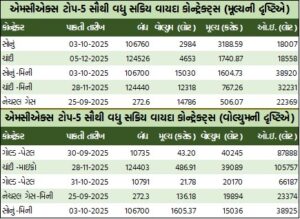 મિની કોલ ઓપ્શન્સમાં ક્રૂડ તેલ-મિની સપ્ટેમ્બર રૂ.7400ની સ્ટ્રાઇક પ્રાઇસવાળો કોલ ઓપ્શન બેરલદીઠ 75 પૈસા ઘટી રૂ.3.25ના ભાવે બોલાયો હતો. નેચરલ ગેસ-મિની સપ્ટેમ્બર રૂ.270ની સ્ટ્રાઇક પ્રાઇસવાળો કોલ ઓપ્શન એમએમબીટીયૂદીઠ 25 પૈસા વધી રૂ.14.55 થયો હતો. સોનું-મિની સપ્ટેમ્બર રૂ.107000ની સ્ટ્રાઇક પ્રાઇસવાળો કોલ ઓપ્શન 10 ગ્રામદીઠ રૂ.130 વધી રૂ.1431ના ભાવે બોલાયો હતો. ચાંદી-મિની સપ્ટેમ્બર રૂ.125000ની સ્ટ્રાઇક પ્રાઇસવાળો કોલ ઓપ્શન કિલોદીઠ રૂ.189.5 વધી રૂ.2450ના ભાવે બોલાયો હતો.