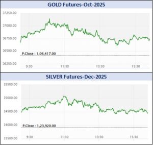 કીમતી ધાતુઓમાં સોના-ચાંદીના વાયદાઓમાં રૂ.9154.40 કરોડનાં કામકાજ થયાં હતાં. એમસીએક્સ સોનું ઓક્ટોબર વાયદો 10 ગ્રામદીઠ રૂ.106676ના ભાવે ખૂલી, ઉપરમાં રૂ.107151 અને નીચામાં રૂ.106600ના સ્તરને સ્પર્શી, રૂ.106417ના આગલા બંધ સામે રૂ.363 વધી રૂ.106780 થયો હતો. ગોલ્ડ-ગિની સપ્ટેમ્બર વાયદો 8 ગ્રામદીઠ રૂ.338 વધી રૂ.85780ના ભાવે ટ્રેડ થઈ રહ્યો હતો. ગોલ્ડ-પેટલ સપ્ટેમ્બર વાયદો 1 ગ્રામદીઠ રૂ.47 વધી રૂ.10735ના ભાવે બોલાયો હતો. સોનું-મિની સપ્ટેમ્બર વાયદો 10 ગ્રામદીઠ રૂ.465 વધી રૂ.105972ના ભાવે બોલાયો હતો. ગોલ્ડ-ટેન સપ્ટેમ્બર વાયદો 10 ગ્રામદીઠ રૂ.106431ના ભાવે ખૂલી, ઉપરમાં રૂ.107187 અને નીચામાં રૂ.106431ના મથાળે અથડાઈ, રૂ.106424ના આગલા બંધ સામે રૂ.441 વધી રૂ.106865ના ભાવે બોલાયો હતો.