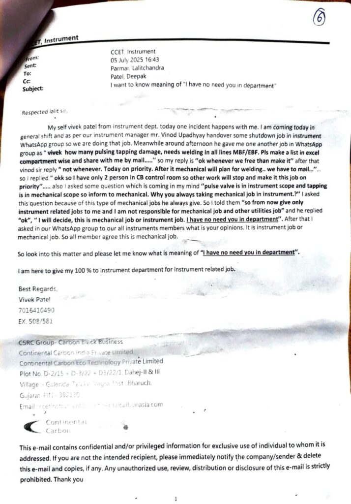 દહેજ GIDC વિસ્તારમાં ગલેન્ડા ગામ નજીક આવેલી Continental Carbon Eco Technology Private Limited કંપનીમાં કાર્યરત Instrument Departmentના કર્મચારીઓ દ્વારા મેનેજમેન્ટ સામે ગંભીર માનસિક ત્રાસ, ધમકી અને શ્રમ કાયદાના ઉલ્લંઘનના આક્ષેપો સાથે અંતિમ કાયદેસર નોટિસ (Final Legal Notice) પાઠવવામાં આવી છે.