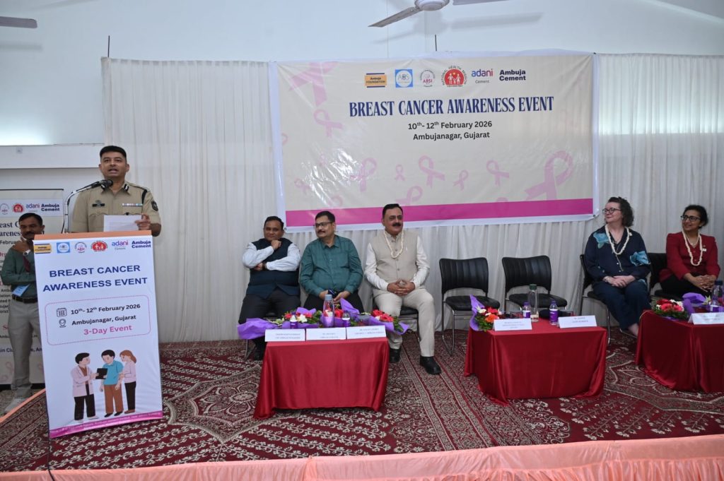 અંબુજા ફાઉન્ડેશન, અંબુજા સિમેન્ટ તથા એસોસિએશન ઓફ બ્રેસ્ટ સર્જરી યુકે તથા ઈન્ડિયા, જિલ્લા આરોગ્ય વિભાગ ગીર સોમનાથના સંયુક્ત ઉપક્રમે બ્રેસ્ટ કેન્સર અવેરનેસ તાલીમ અને ફ્રી બ્રેસ્ટ કેન્સર નિદાન કેમ્પનું આયોજન તા: ૧૦ થી ૧૨ ફેબ્રુઆરી ૨૦૨૬ ના રાખવામાં આવેલ. આ કાર્યક્રમના ઉદઘાટનના મુખ્ય અતિથિ તરીકે શ્રી નીલેશ જાજડિયા સાહેબ IPS, ઇન્સ્પેકટર જનરલ ઓફ પોલીસના હસ્તે દીપ પ્રાગટ્ય અને શુભેચ્છા સંદેશ દ્વારા કરવામાં આવેલ.