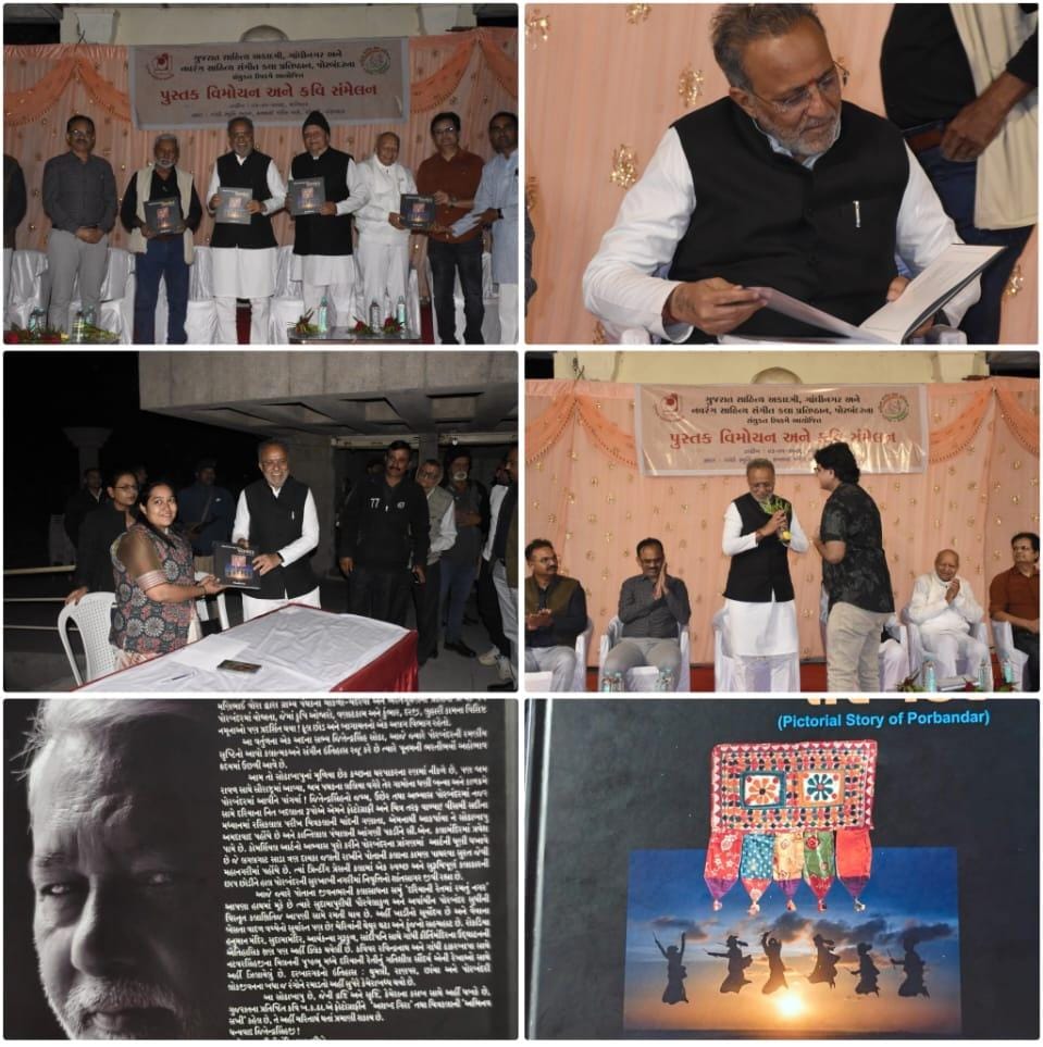 પોરબંદરના ગાંધી સ્મૃતિ ભવન ચોપાટી ખાતે ગુજરાત સાહિત્ય એકાદમી, ગાંધીનગર તથા નવરંગ સાહિત્ય સંગીત કલા પ્રતિષ્ઠાન, પોરબંદરના સંયુક્ત ઉપક્રમે આયોજિત પુસ્તક વિમોચન અને કવિ સંમેલન કાર્યક્રમ ભવ્ય રીતે યોજાયો હતો. આ કાર્યક્રમમાં વન અને પર્યાવરણ વિભાગના કેબિનેટ મંત્રી અર્જુનભાઈ મોઢવાડિયા મુખ્ય મહેમાન તરીકે ઉપસ્થિત રહ્યા હતા.