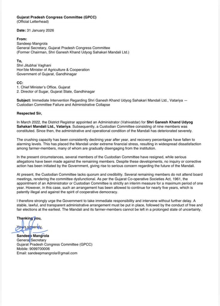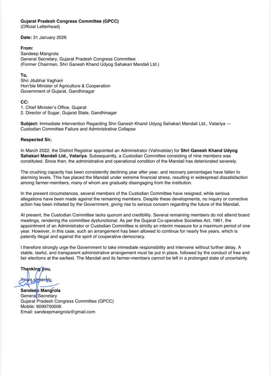 દક્ષિણ ગુજરાતના સહકારી ક્ષેત્રની મહત્વની સંસ્થા એવી શ્રી ગણેશ ખાંડ ઉદ્યોગ સહકારી મંડળી (વટારિયા) માં હાલ ગંભીર વહીવટી મડાગાંઠ સર્જાઈ છે. વચગાળાની કસ્ટોડિયન કમિટીના સભ્યોએ ધડાધડ રાજીનામા ધરી દેતા સંસ્થામાં ‘ક્વોરમ’ નો અભાવ સર્જાયો છે, જેના કારણે દૈનિક કામગીરી અને નિર્ણય પ્રક્રિયા સંપૂર્ણપણે ઠપ્પ થઈ ગઈ હોવાનો આક્ષેપ ગુજરાત પ્રદેશ કોંગ્રેસ સમિતિના મહામંત્રી અને સંસ્થાના પૂર્વ ચેરમેન સંદીપ માંગરોલાએ કર્યો છે.