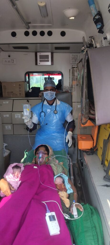 મહિલાને તાત્કાલિક નજીકની હોસ્પિટલ લઈ જવા માટે એમ્બ્યુલન્સ રવાના થઈ હતી પરંતુ રસ્તામાં જ મહિલાને તીવ્ર પીડા વધી જતા ઈમરજન્સી ડિલિવરી કરવાની ફરજ પડી. બ્રિચ પ્રેઝન્ટેશનના કારણે માતા અને બંને નવજાતના જીવનને જોખમ હતો, છતાં 108ની ટીમે પોતાની કુશળતા, શાંતિપૂર્ણ અભિગમ અને એમ્બ્યુલન્સમાં ઉપલબ્ધ સુવિધાઓનો ઉપયોગ કરીને એંબ્યુલન્સમાં જ સફળ ડિલિવરી કરાવી.