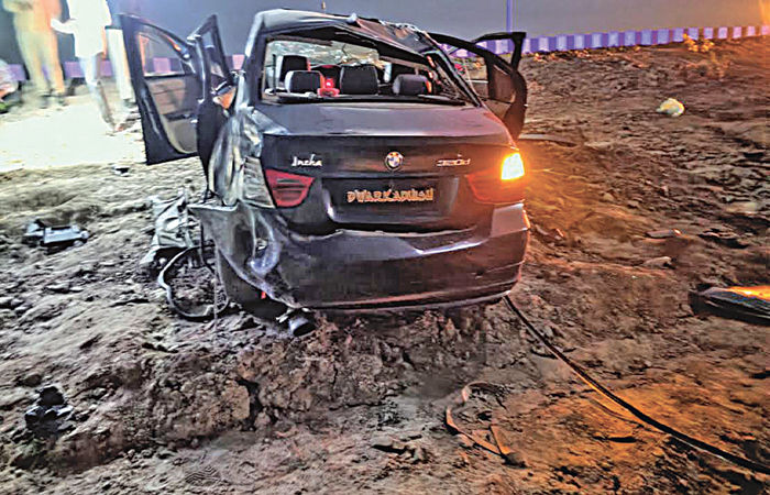 શનિવારે વહેલી સવારે આશરે ૪ઃ૩૦ વાગ્યાના અરસામાં કાર ધોળકા તાલુકાના સરંડી ગામની સીમ પાસે પહોંચી ત્યારે ચાલકે ગફલતભરી રીતે ગાડી હંકારી સ્ટિયરિંગ પરનો કાબૂ ગુમાવી દીધો હતો. કાર એટલી ઝડપે હતી કે રોડ સાઈડના બોર્ડ સાથે ભટકાતા જ તેનું આગળનું ટાયર નીકળી ગયું હતું અને બોનેટનો કચ્ચરઘાણ વળી ગયો હતો.