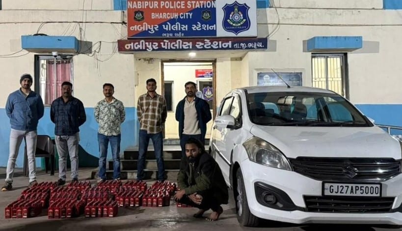 ભરૂચ ક્રાઇમ બ્રાન્ચે નબીપુર પોલીસ સ્ટેશન વિસ્તારમાં ફિલ્મી ઢબે થતી દારૂની હેરાફેરીનો પર્દાફાશ કરી બુટલેગરોની આધુનિક મોડસ ઓપરેન્ડી પર પાણી ફેરવી દીધું છે. હિંગલ્લા ચોકડીથી કોઠી તરફ જતા રસ્તા પર ઇન્ડિયન ઓઇલ પંપ પાછળ આવેલા એક ખુલ્લા ખેતરમાં સફેદ કલરની અર્ટિગા કારમાં દારૂનો જથ્થો છુપાવ્યો હોવાની સચોટ બાતમીના આધારે પોલીસે દરોડો પાડ્યો હતો. તપાસ દરમિયાન લક્ઝરી કારમાં ખાસ રીતે તૈયાર કરવામાં આવેલા ગુપ્ત ‘ચોરખાના’ માંથી ભારતીય બનાવટના વિદેશી દારૂની નાની-મોટી ૧૦૦૮ બોટલો મળી આવતા પોલીસ પણ ચોંકી ઉઠી હતી.