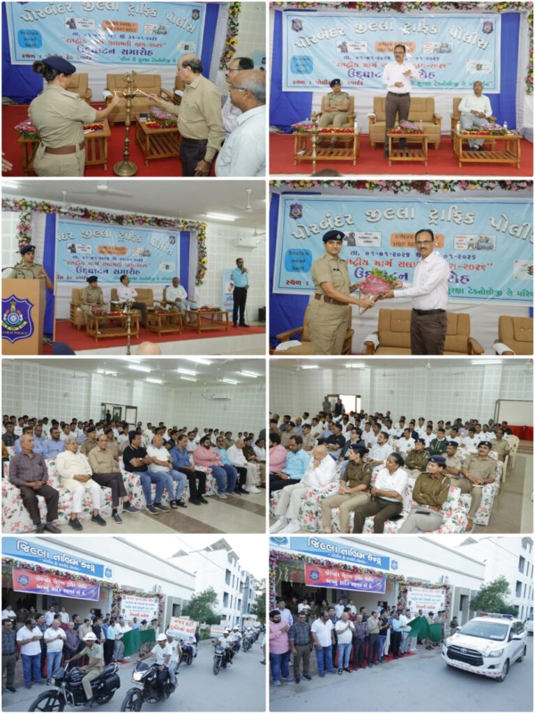 સમગ્ર રાજ્યમાં ગુજરાત પોલીસ દ્વારા તા. ૧ જાન્યુઆરીથી ૩૧ જાન્યુઆરી ૨૦૨૬ દરમિયાન માર્ગ સલામતી માસની ઉજવણી કરવામાં આવી રહી છે. આ અનુસંધાને પોરબંદર જિલ્લામાં પણ પોલીસ અધિક્ષક ભગીરથસિંહ જાડેજાના માર્ગદર્શન અને સૂચનાથી પોરબંદર પોલીસ હેડક્વાર્ટર ખાતે પોરબંદર પોલીસ અને જેસીઆઈ પોરબંદરના સંયુક્ત ઉપક્રમે માર્ગ સલામતી માસની ઉજવણીનો ઉદ્ઘાટન સમારોહ યોજાયો હતો.