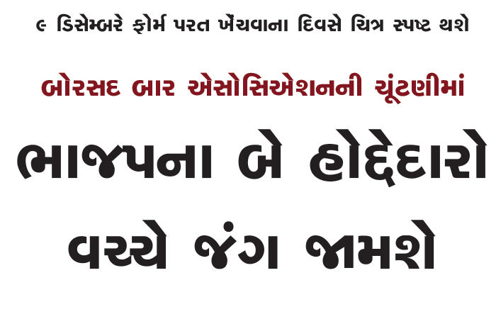 બોરસદ બાર એસોસિએશનની તા. ૧૯મીએ યોજાનારી ચૂંટણીમાં પ્રમુખ પદ માટે બોરસદ શહેર ભાજપના સંગઠન પૂર્વ પ્રમુખ ભવરસિંહ પુરોહિત સામે માર્કેટયાર્ડના ડિરેક્ટર તુષાર પટેલ ફોર્મ ભર્યું છે. જોકે, ભાજપના અગ્રણીઓ બંને સમજાવટના પ્રયાસો હાથ ધર્યા છે. તા. ૯ ડિસેમ્બર ફોર્મ પરત ખેંચવાના દિવસે ચિત્ર સ્પષ્ટ થશે.