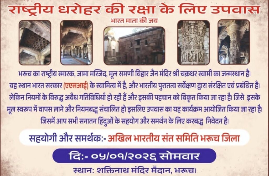 ભરૂચ સ્થિત રાષ્ટ્રીય સ્મારક એવી જામા મસ્જિદ, જે મૂળ સમણી વિહાર જૈન મંદિર અને શ્રી ચક્રધર સ્વામીનું જન્મસ્થાન હોવાનું માનવામાં આવે છે, તેના રક્ષણ માટે આગામી સોમવારે એક વિશાળ કાર્યક્રમ યોજાવા જઈ રહ્યો છે. અખિલ ભારતીય સંત સમિતિ, ભરૂચ જિલ્લા દ્વારા આ ઐતિહાસિક ધરોહરની રક્ષા કાજે ‘રાષ્ટ્રીય ધરોહર કી રક્ષા કે લિયે ઉપવાસ’ ના નામે એક દિવસીય ધરણા અને ઉપવાસનું આયોજન કરવામાં આવ્યું છે. આ સ્થાન હાલમાં ભારત સરકાર (ASI) ના હસ્તક છે, પરંતુ ત્યાં નિયમો વિરુદ્ધની ગેરકાયદેસર પ્રવૃત્તિઓ થતી હોવાના અને તેની અસલી ઓળખ સાથે ચેડાં કરવામાં આવતા હોવાના આક્ષેપો સાથે આ લડત શરૂ કરવામાં આવી છે.