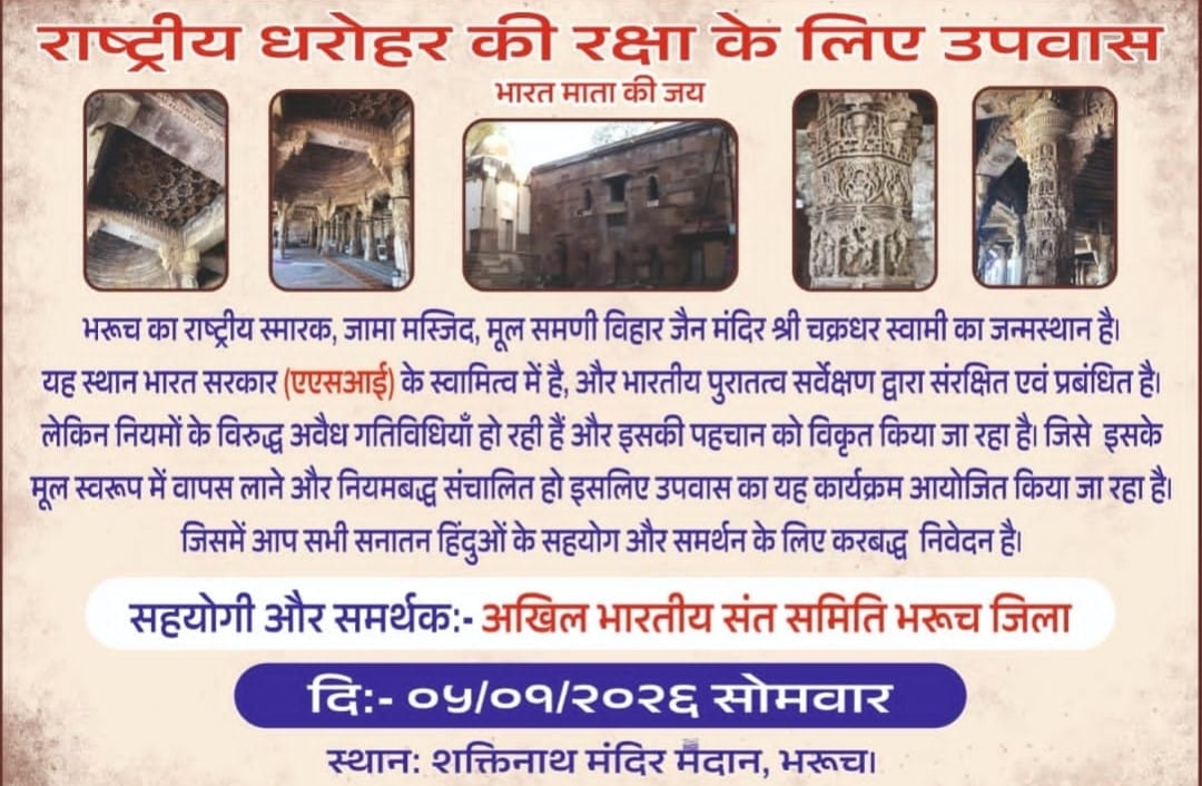ભરૂચ સ્થિત રાષ્ટ્રીય સ્મારક એવી જામા મસ્જિદ, જે મૂળ સમણી વિહાર જૈન મંદિર અને શ્રી ચક્રધર સ્વામીનું જન્મસ્થાન હોવાનું માનવામાં આવે છે, તેના રક્ષણ માટે આગામી સોમવારે એક વિશાળ કાર્યક્રમ યોજાવા જઈ રહ્યો છે. અખિલ ભારતીય સંત સમિતિ, ભરૂચ જિલ્લા દ્વારા આ ઐતિહાસિક ધરોહરની રક્ષા કાજે ‘રાષ્ટ્રીય ધરોહર કી રક્ષા કે લિયે ઉપવાસ’ ના નામે એક દિવસીય ધરણા અને ઉપવાસનું આયોજન કરવામાં આવ્યું છે. આ સ્થાન હાલમાં ભારત સરકાર (ASI) ના હસ્તક છે, પરંતુ ત્યાં નિયમો વિરુદ્ધની ગેરકાયદેસર પ્રવૃત્તિઓ થતી હોવાના અને તેની અસલી ઓળખ સાથે ચેડાં કરવામાં આવતા હોવાના આક્ષેપો સાથે આ લડત શરૂ કરવામાં આવી છે.