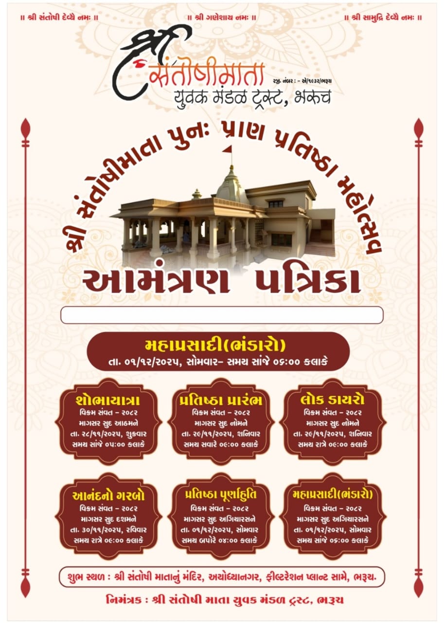 ભરૂચના અયોધ્યાનગર, ફિલ્ટરેશન પ્લાન્ટ સામે આવેલા શ્રી સંતોષી માતા મંદિરે શ્રી સંતોષી માતા યુવક મંડળ ટ્રસ્ટ દ્વારા ભવ્ય ‘પુનઃ પ્રાણ પ્રતિષ્ઠા મહોત્સવ’નું આયોજન કરવામાં આવ્યું છે. આ ચતુર્થ દિવસીય મહોત્સવ તા. ૨૮ નવેમ્બર, શુક્રવારથી શરૂ થઈને તા. ૧ ડિસેમ્બર, સોમવાર સુધી ચાલશે, જેમાં સંતોષી માતાના તમામ ભક્તોને ધર્મલાભ લેવા માટે ભાવભર્યું નિમંત્રણ પાઠવવામાં આવ્યું છે.