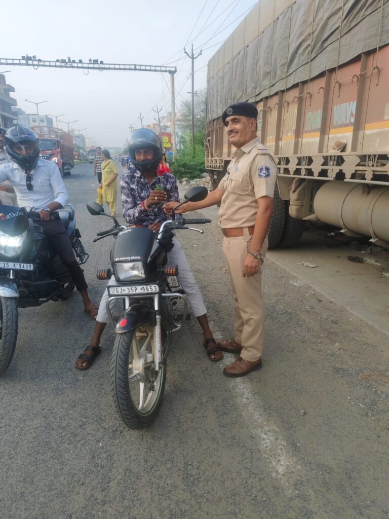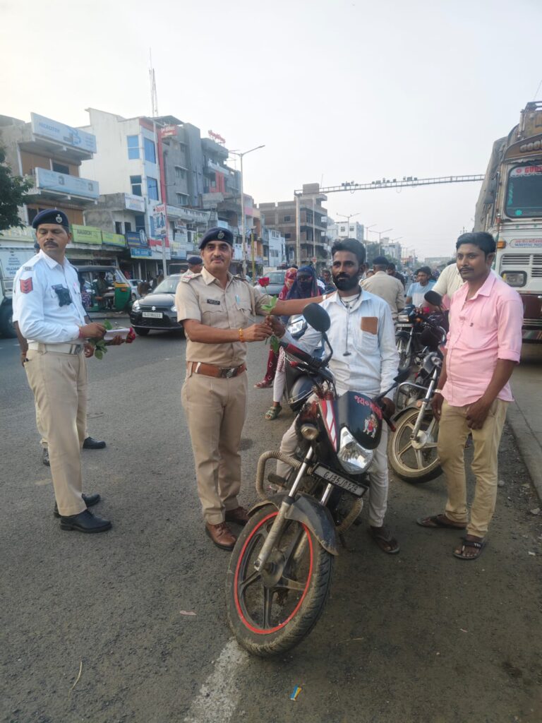 તથા હેલ્મેટ પહેરી ટુવ્હીલર વાહન ચલાવતા વાહનચાલકોને પણ રોકી ટ્રાફિક નિયમોનું સારી રીતે પાલન કરવા બદલ તેમને પણ ફુલ આપી સન્માનિત કરી ભવિષ્યમાં પણ આવી જ રીતે નિયમોનું પાલન કરતા રહે તે માટે પ્રોત્સાહિત કરવામાં આવેલ છે.પોલીસની આ સરાહનીય પહેલને પ્રજાજનો દ્વારા ખુબજ બિરદાવીને ભવિષ્યમાં ટ્રાફિકના નિયમોનું પાલન કરવાનું વચન આપેલ હતું.