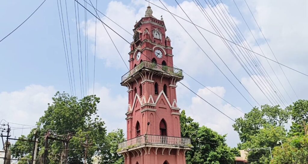 ઘડિયાળનું મશીન બગડ્યુંછે તેથી ઘડિયાળ બંધ હાલત માં છે. ચારે બાજુ ઘાસ ઊગી નીકળ્યું છે.ત્યારે