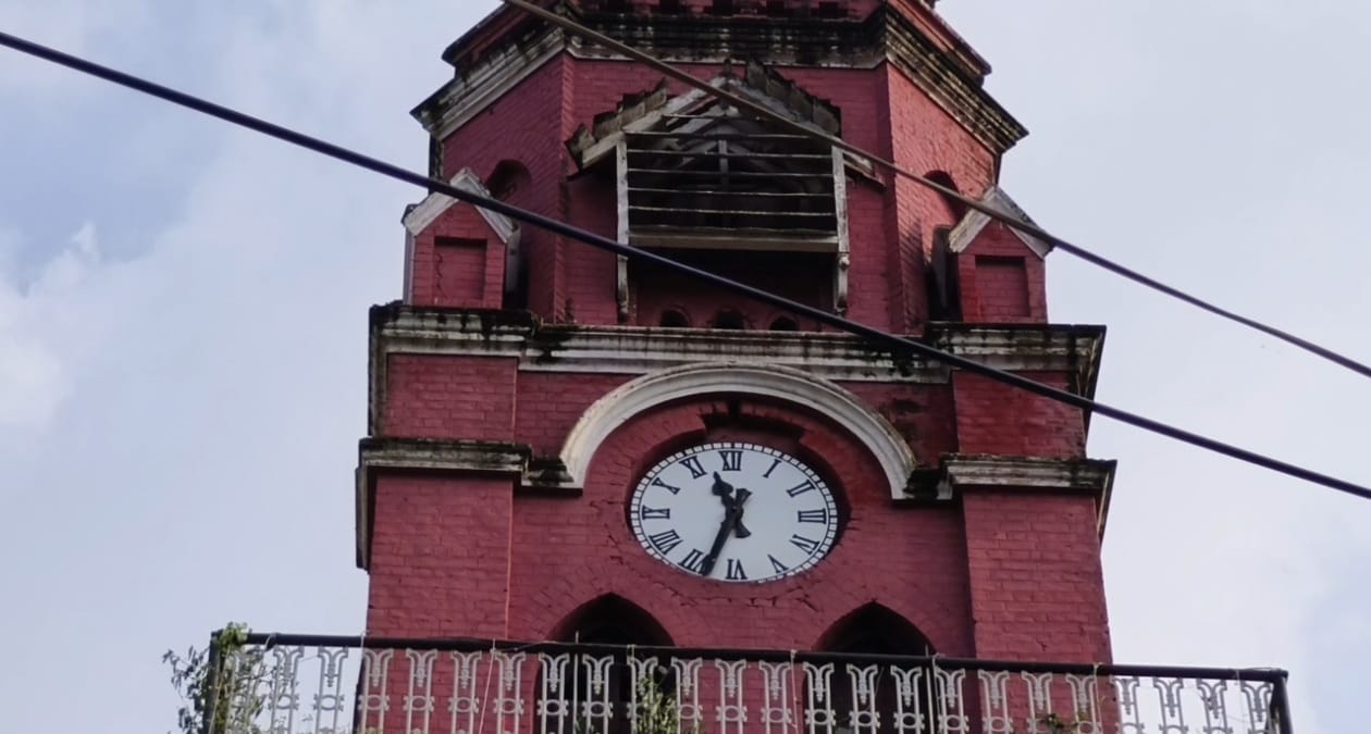 ઘડિયાળનું મશીન બગડ્યુંછે તેથી ઘડિયાળ બંધ હાલત માં છે. ચારે બાજુ ઘાસ ઊગી નીકળ્યું છે.ત્યારે