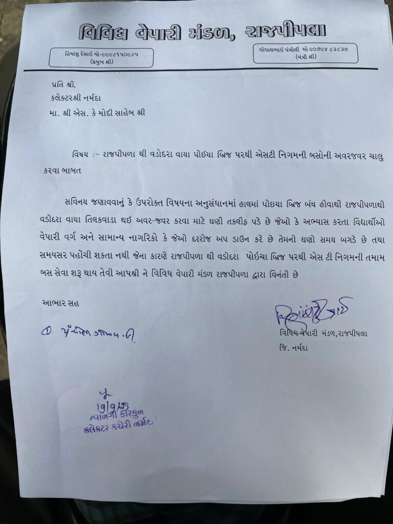 રાજપીપળા વિવિધ વેપારી સંગઠન દ્વારા નર્મદા જિલ્લા કલેકટરને પોઇચા પુલ પર પુનઃ એસટી નિગમની બસ ચાલુ કરવા લેખિતમાં